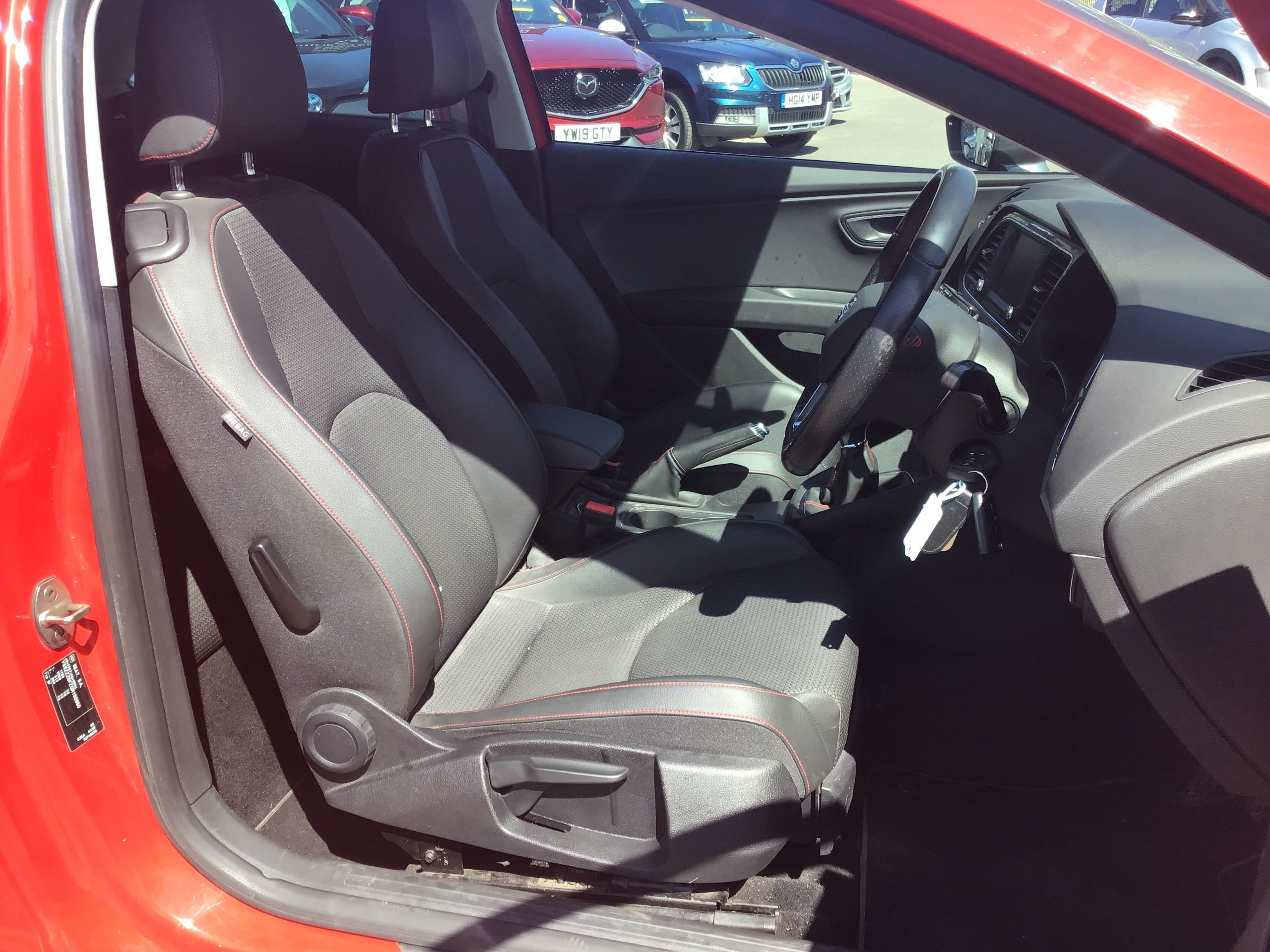 - Steering Wheel - Flat-Bottomed Perforated Leather with Red Stitching and FR Logo